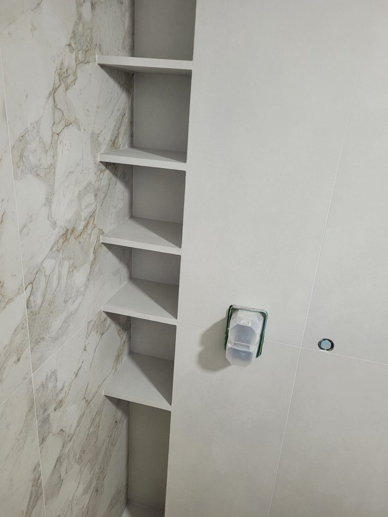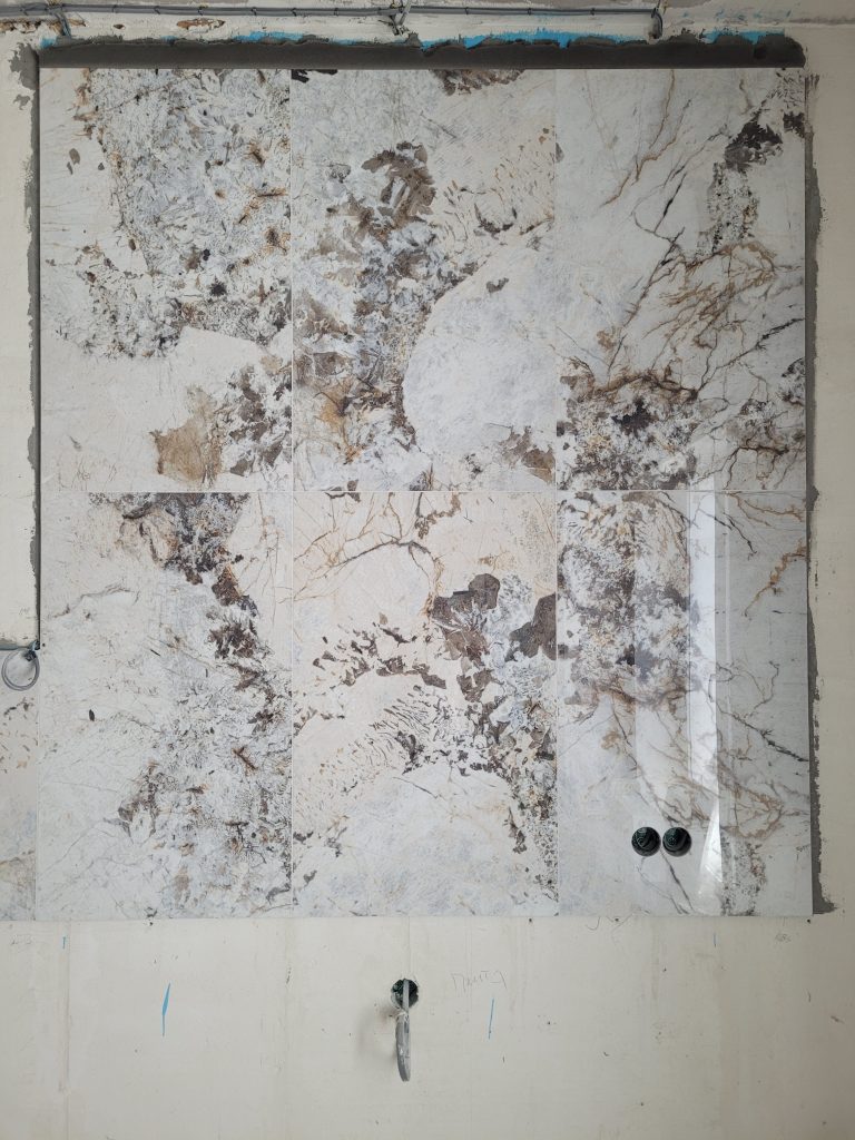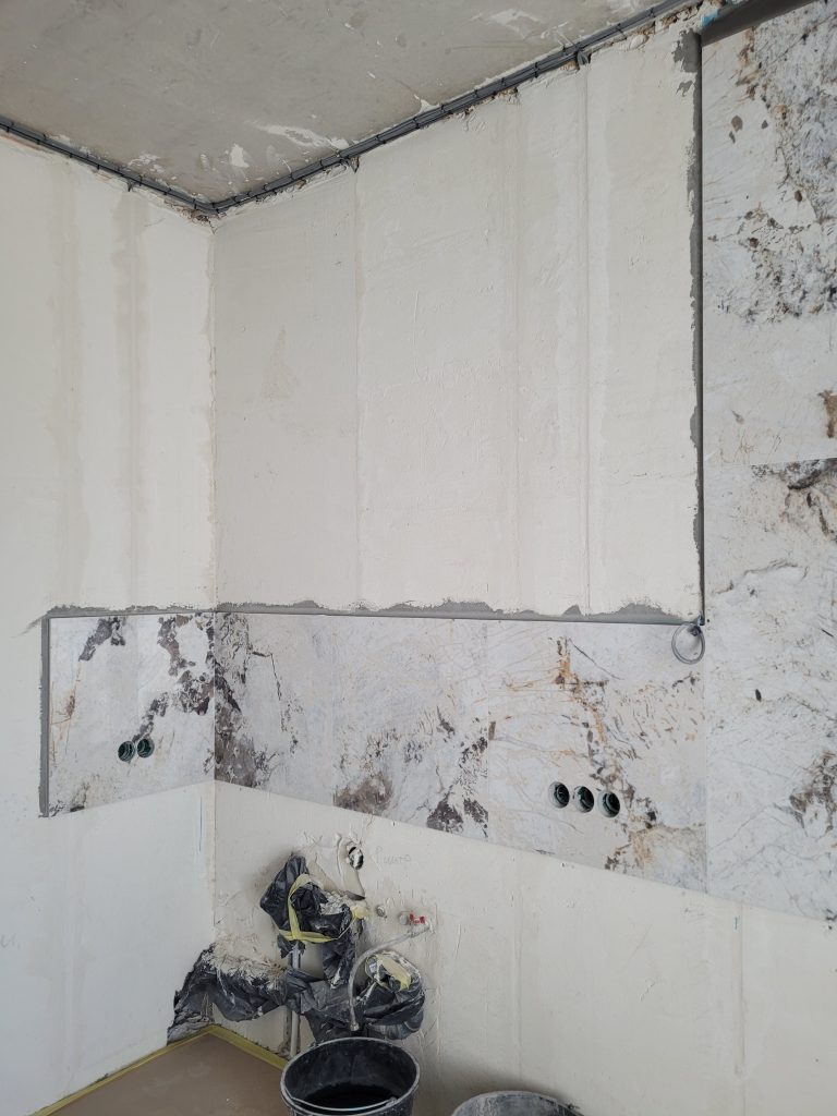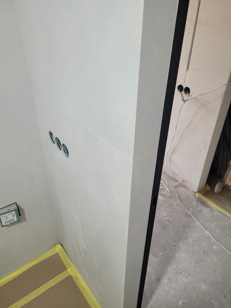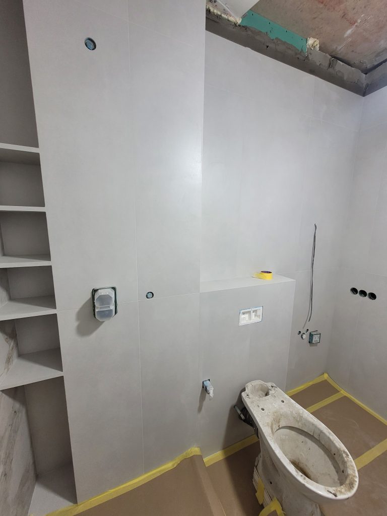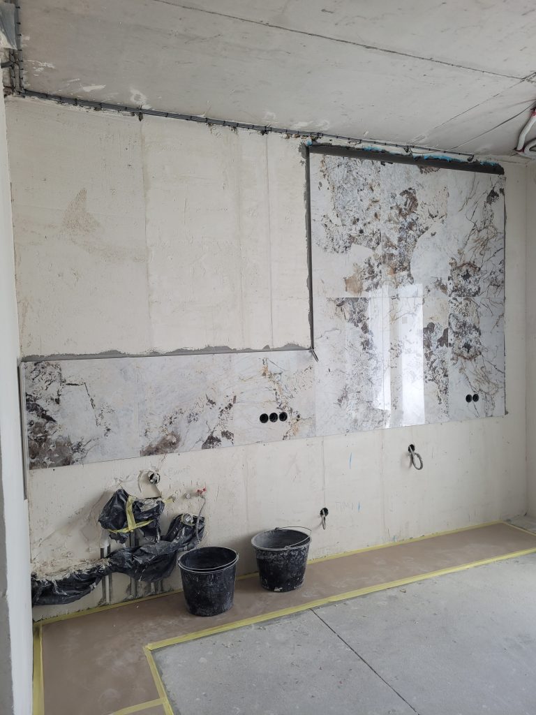 Облицювали підлогу в прихожій, санвузлі та під кухнею. Стикувати плитку на підлозі плануємо за проектом з ламінітом плаваючим способом вкладання, ялинкою. Також стіни в санвузлі і робоча зона в хухні з плитки. Плита скрізь керамограніт 600х1200 мм.