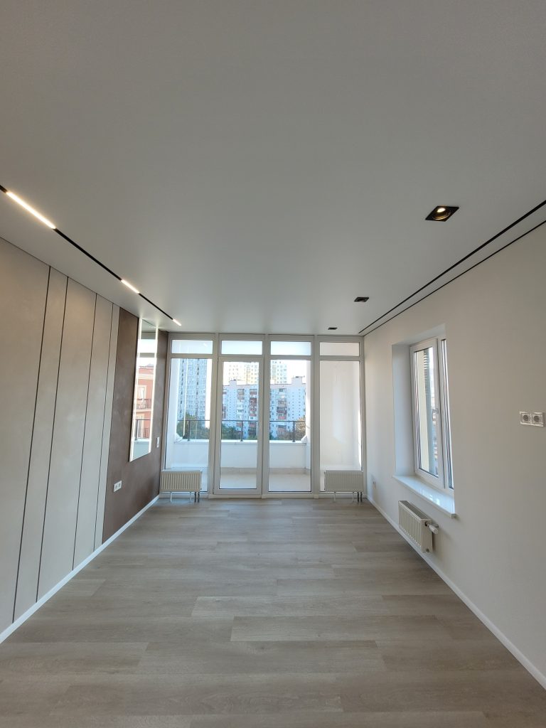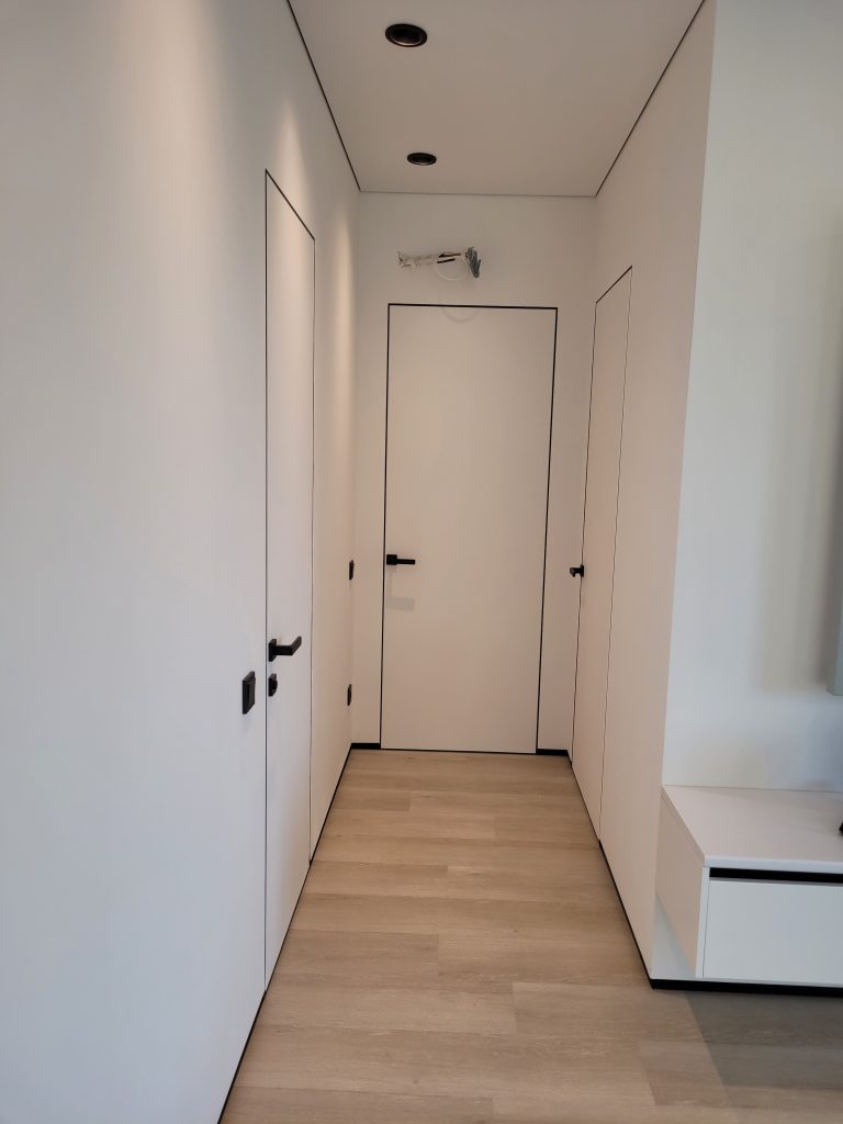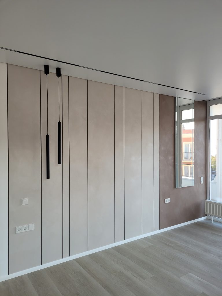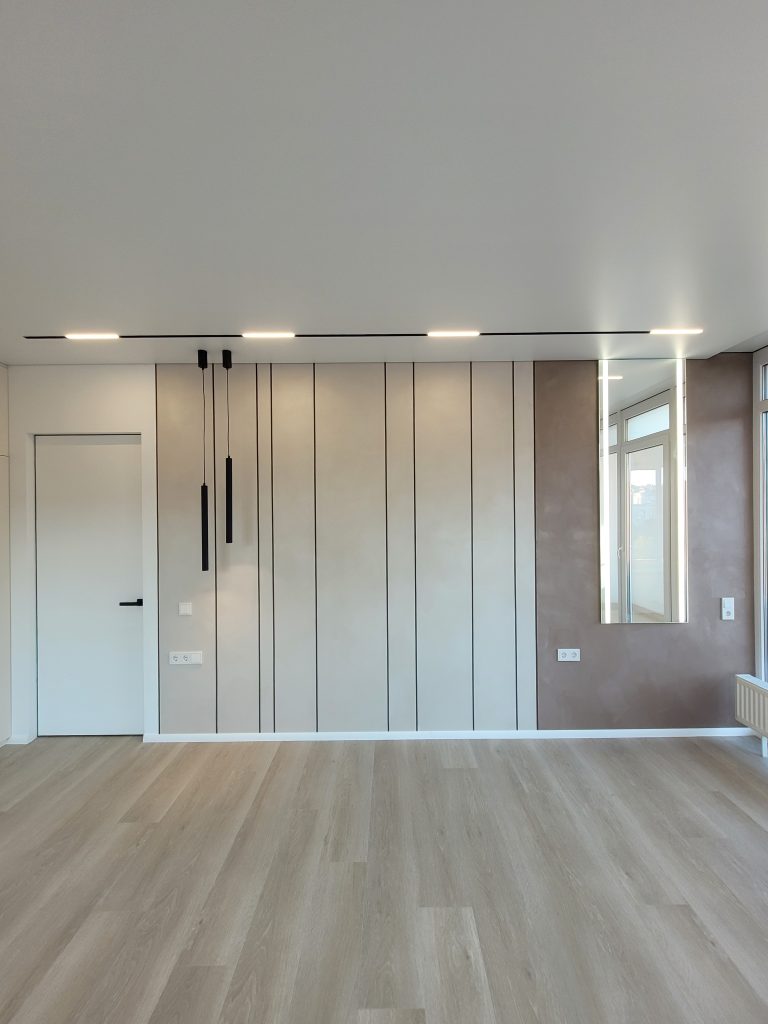 Реалізовували ремонт за дизайн проектом з візуалізацією. З цікавих елементів – прихований тіньовий плінтус, тіньовий профіль стелі, клейовий вініл одним контуром по всій площі, декоративна штукатурка, двері прихованого монтажа.