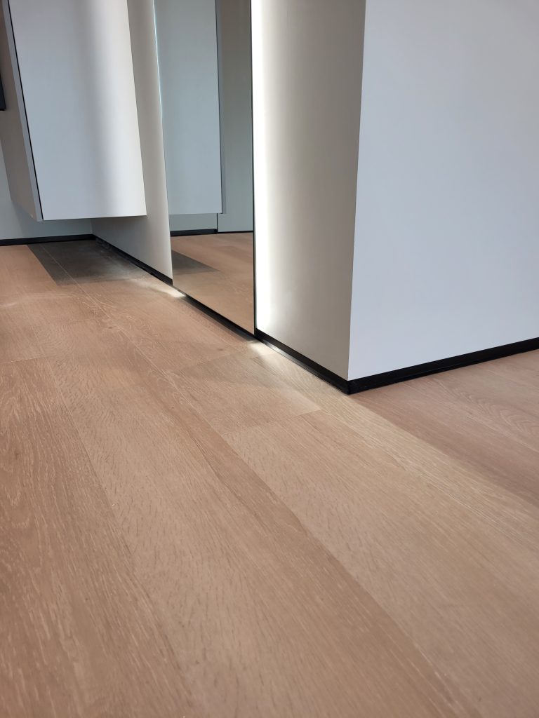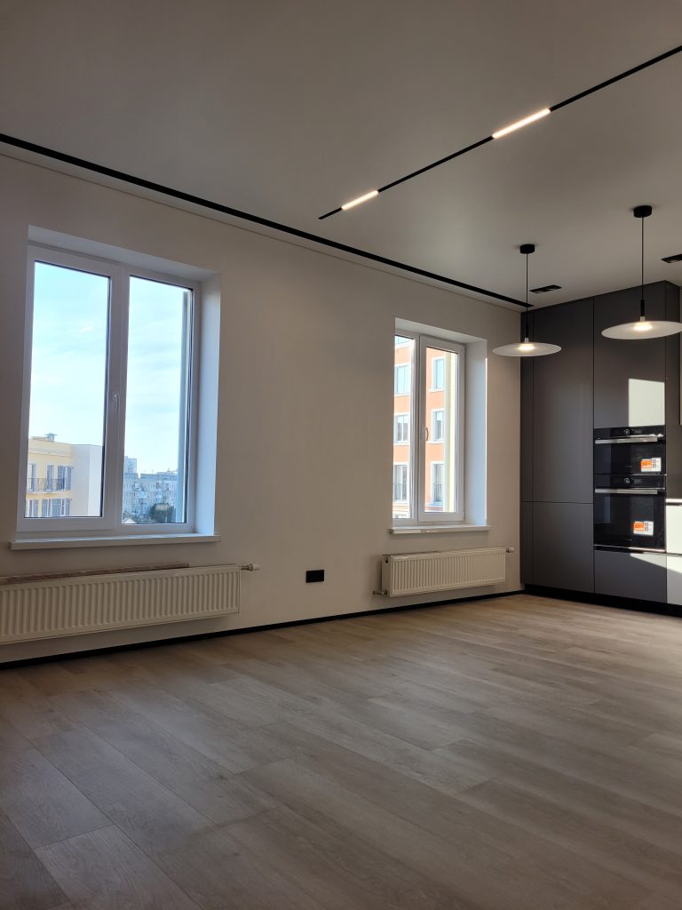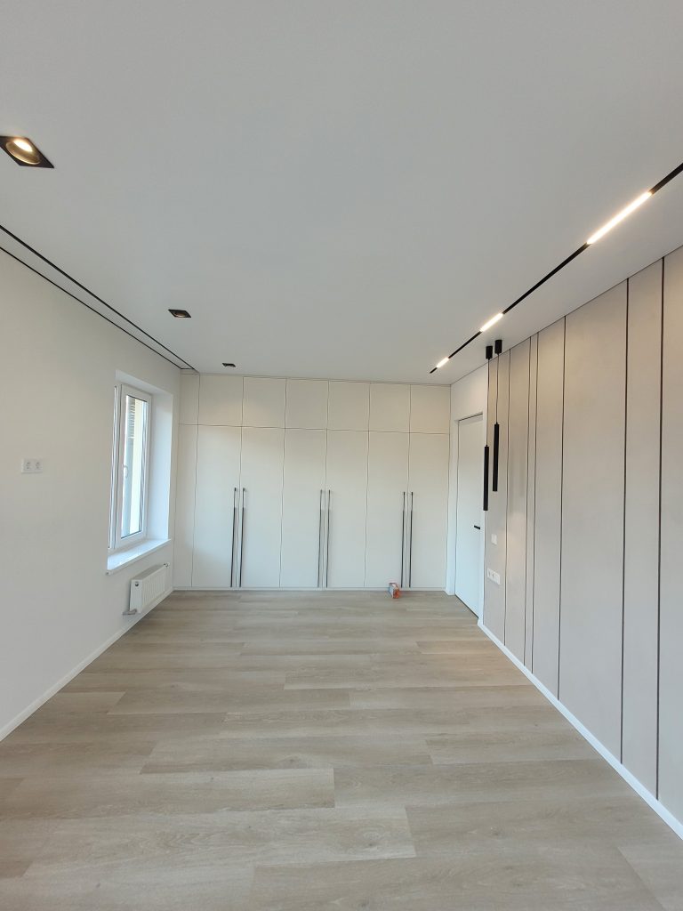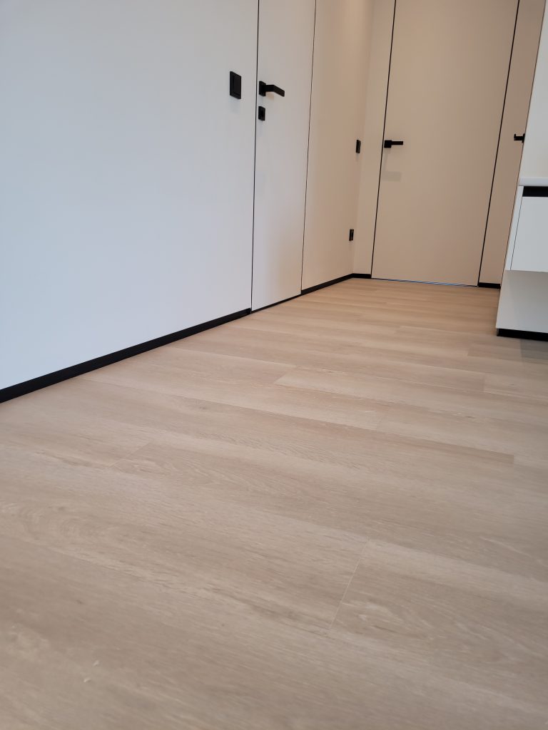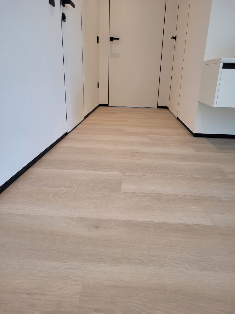 Реалізовували ремонт за дизайн проектом з візуалізацією. З цікавих елементів – прихований тіньовий плінтус, тіньовий профіль стелі, клейовий вініл одним контуром по всій площі, декоративна штукатурка, двері прихованого монтажа.